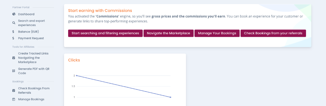 In Ihrem Dashboard können Sie monatliche Statistiken für Klicks und Ansichten einsehen, die von Ihren verfolgten Links generiert wurden. Außerdem können Sie die Anzahl und den Gesamtbetrag der Buchungen und Provisionen sehen, die Sie ggf. erzielt haben.