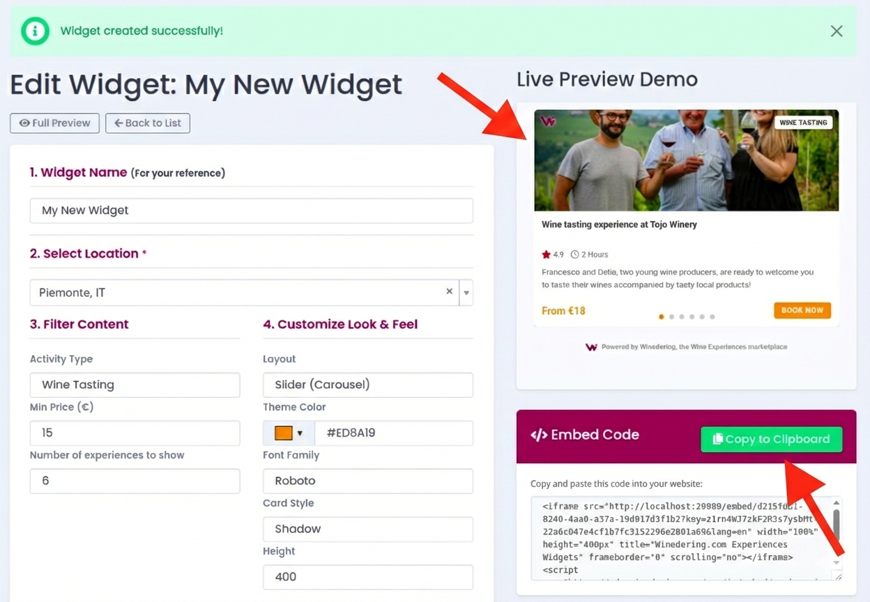 Filter Content: Choose the type of activity (e.g., Wine Tasting) and the number of experiences you want to display in the widget.