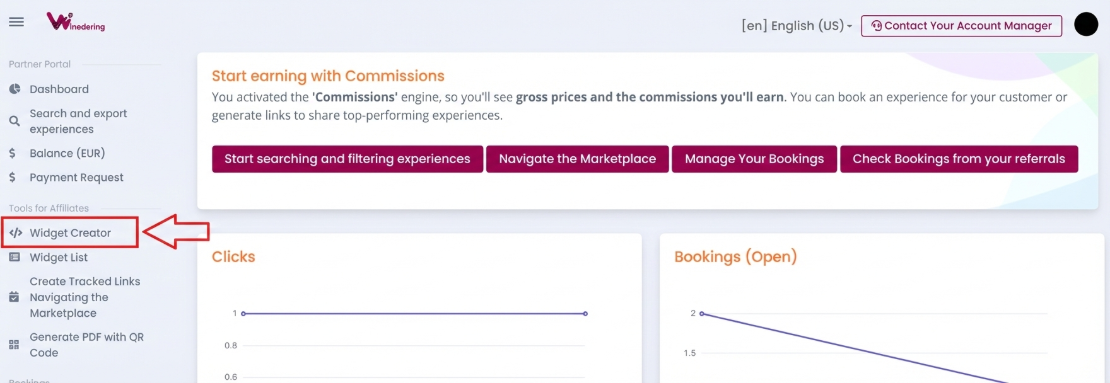 From the main B2B portal panel, locate the Tools for Affiliates section in the sidebar menu and select Widget Creator.