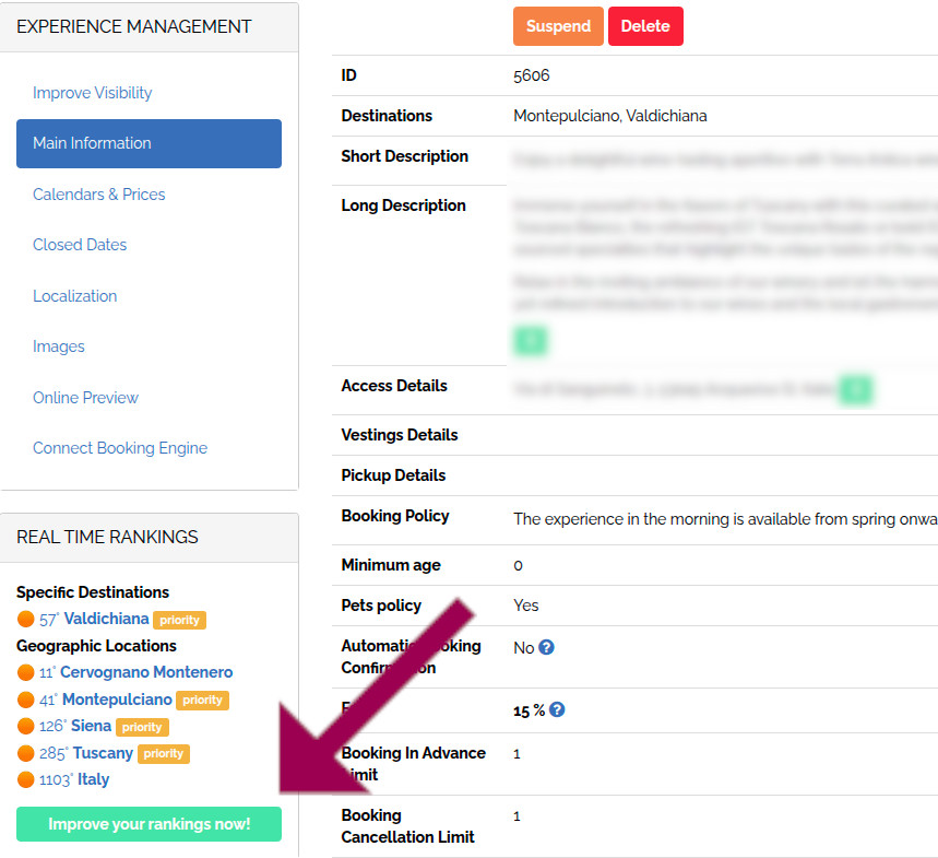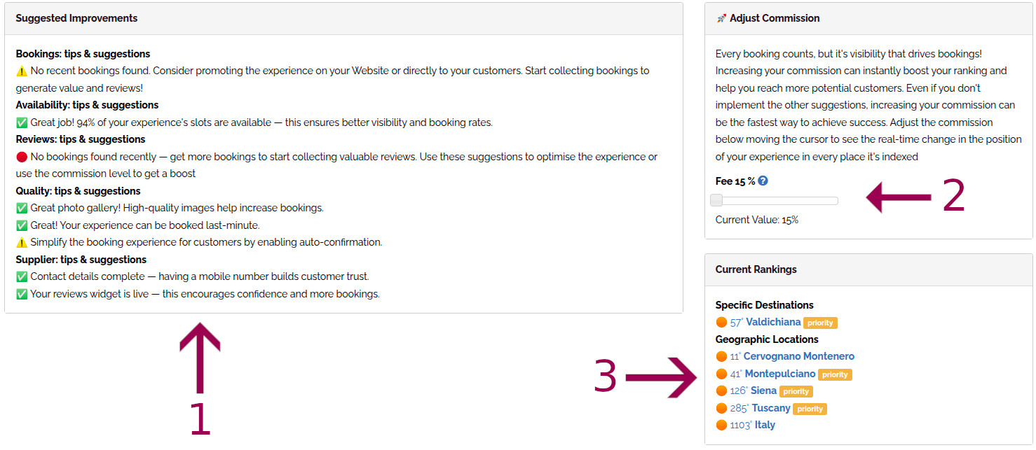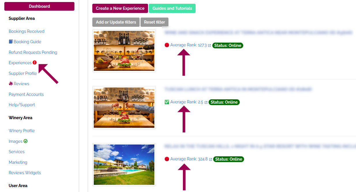 Chaque expérience sur Winedering dispose d'un outil intégré d'auto-évaluation qui montre son classement réel dans toutes les destinations où elle apparaît et vous donne des suggestions concrètes et personnalisées pour grimper dans ces classements.