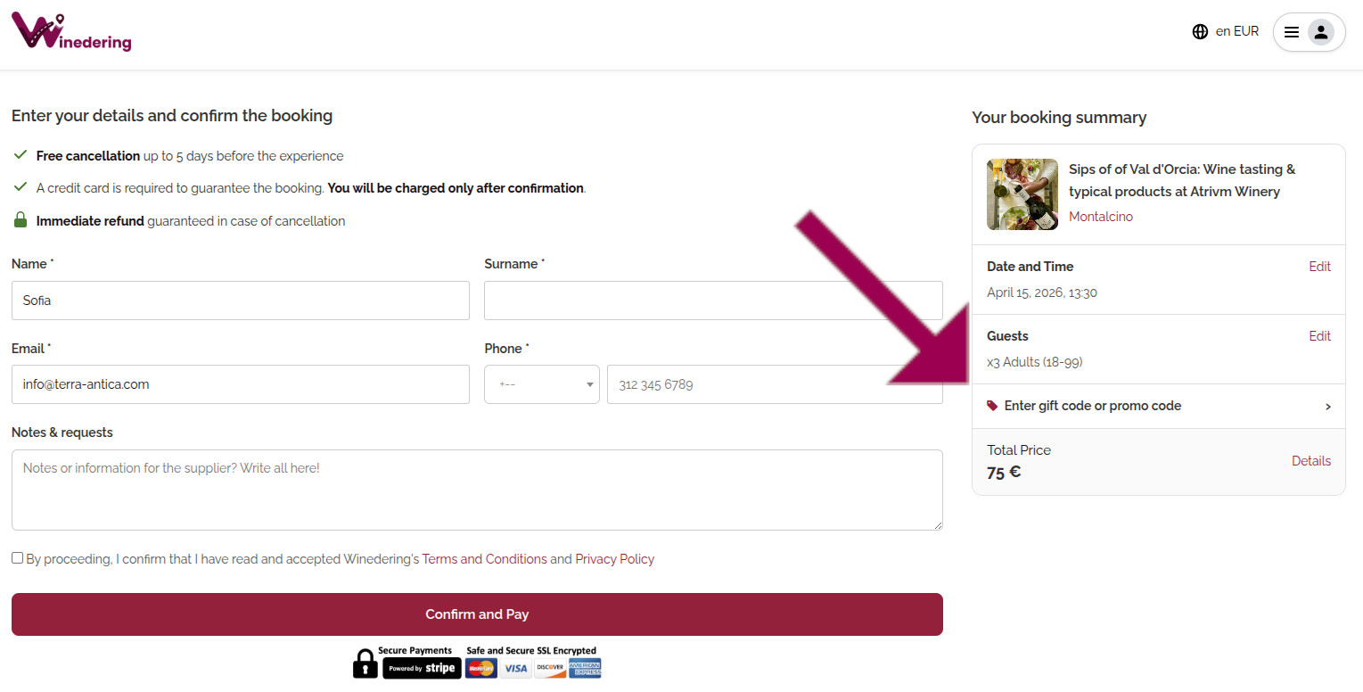 5) If your voucher is still valid, not yet expired and not yet used, you will notice a reduction in the booking amount by the value of the voucher. If the voucher value exceeds the total booking amount, the total amount will show as "0". In the image above, the voucher value is "75 €".