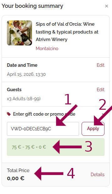 To redeem a gift, promotional, or voucher code, you need to enter the code in the appropriate field while making a booking. Follow these steps to apply the code: