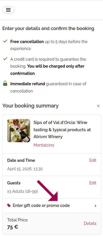 3) On the checkout page, you'll see your booking summary on the right (or below on mobile). Click on "Enter gift code or promo code" to expand the voucher field.