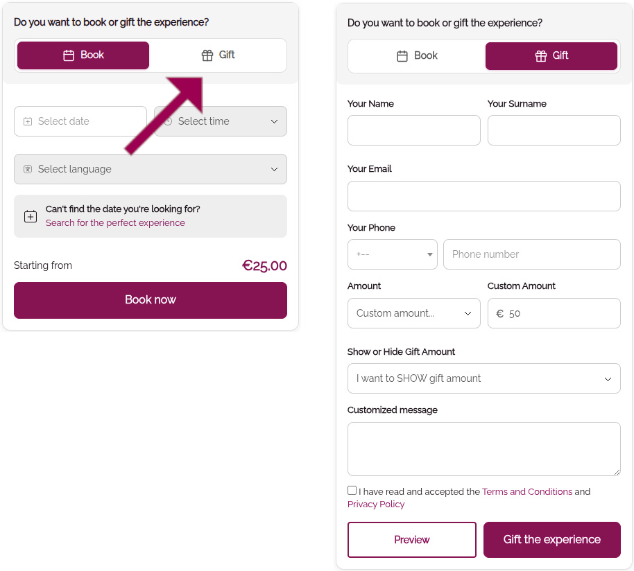 Switch to Gift mode. At the top of the booking panel, next to the Book button, click the Gift button. The form will change into the gift voucher form. (See the screenshot above: the arrow points to the Gift button.)